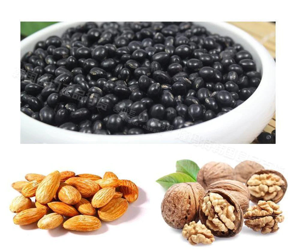 Bước 1: Ngâm nguyên liệu: óc chó khoảng 1 tiếng, bỏ vỏ lấy nhân, nếu bóc được vỏ lụa thì càng tốt; đậu đen/đậu xanh/đậu nành,… ngâm từ 8 – 10 tiếng hoặc qua đêm, lọc vỏ; hạnh nhân ngâm khoảng 4 tiếng bóc vỏ lụa.