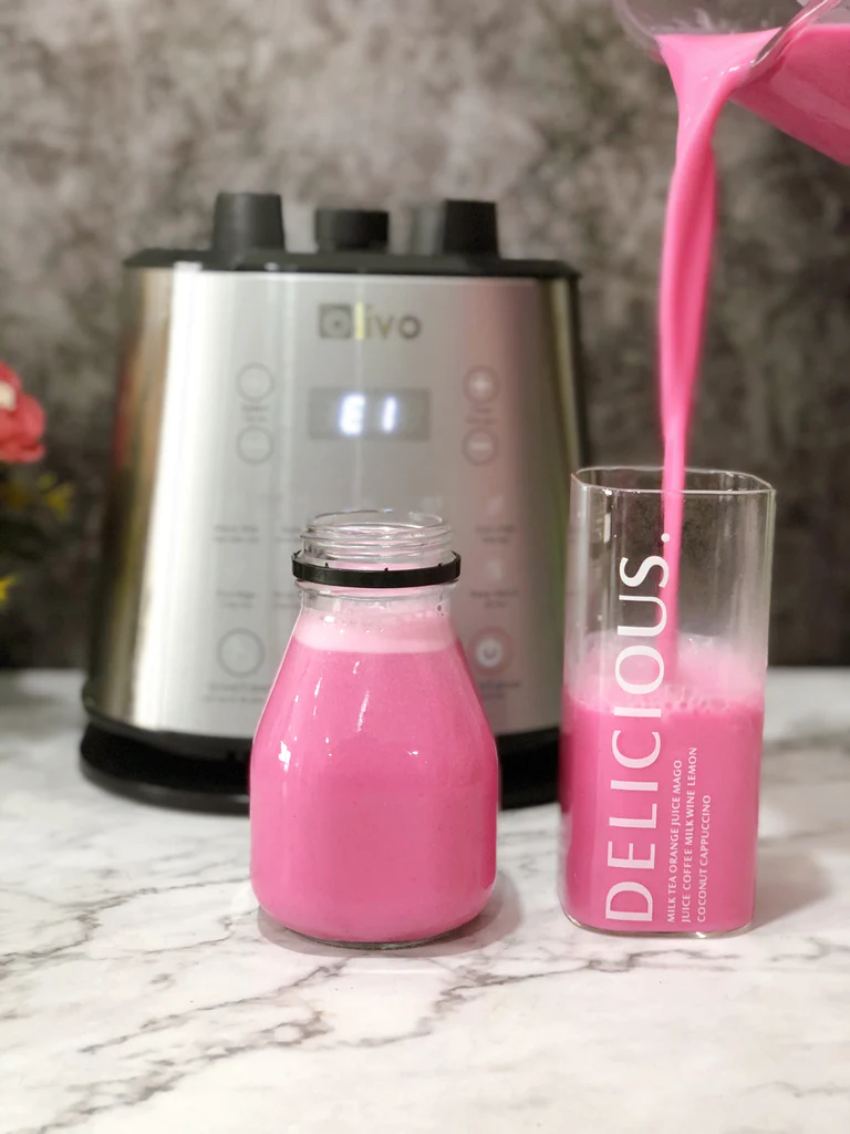Cho tất cả các nguyên liệu vừa chuẩn bị vào máy xay với đường thốt nốt, ít muối hồng, 1,2 lít nước. Chọn chế độ sữa không nấu. Thành phẩm có màu đỏ bắt mắt, vị ngọt dịu.