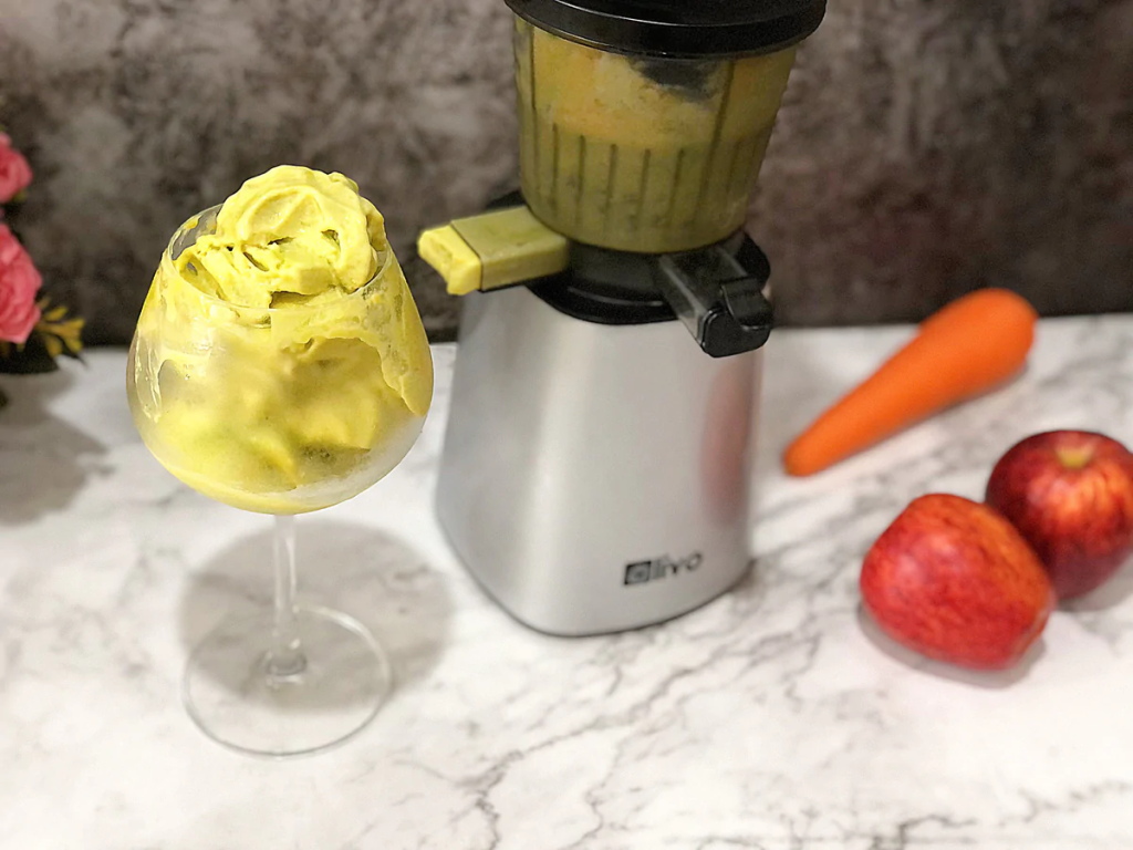 Sau khi các nguyên liệu đã sẵn sàng thì bạn lắp lưới làm kem vào trong máy ép chậm. Olivo SJ210 tích hợp lưới làm kem rất tiện, thành phẩm cho ra mịn màng, bắt mắt.
