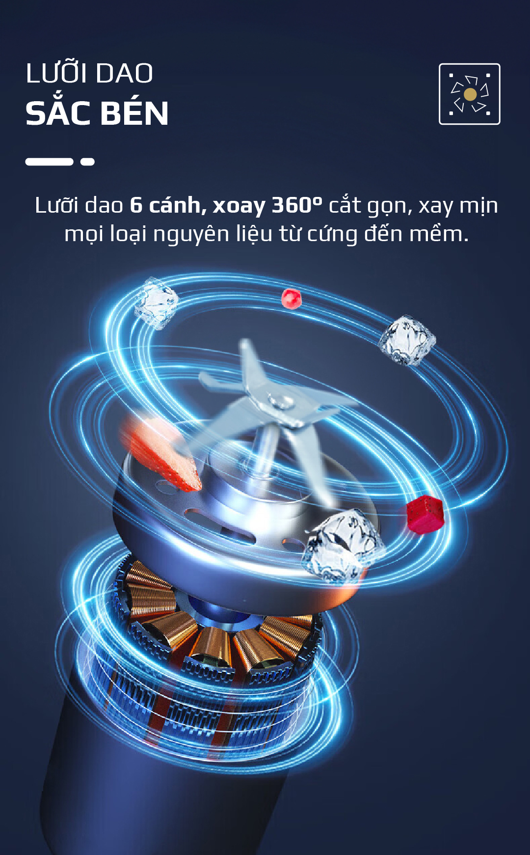 • Thành phẩm xay vô cùng nhuyễn mịn, thậm chí làm được cả đá bào vì máy có đến 6 lưỡi dao và công suất lên đến 150W, quay được 16.500 vòng/phút, nên anh chị hoàn toàn yên tâm về độ nhuyễn mịn.