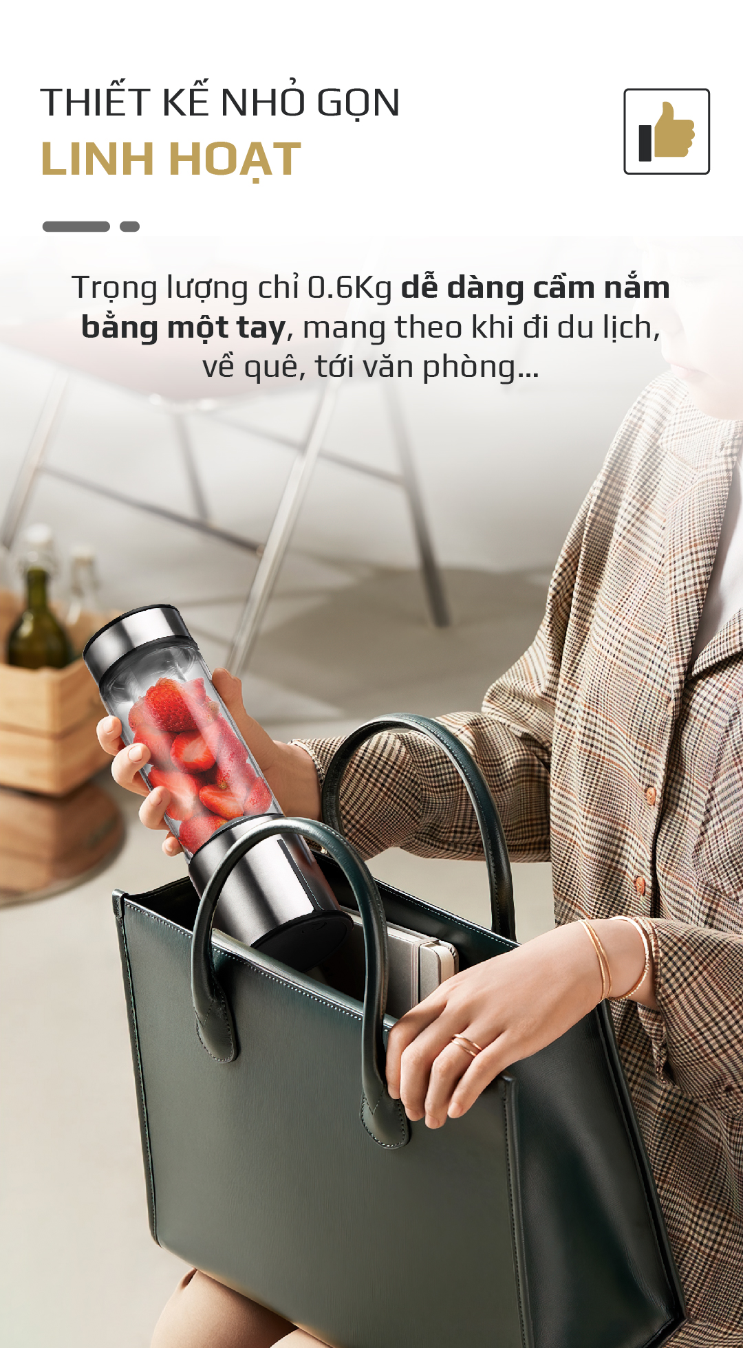 • Sản phẩm có thiết kế nhỏ gọn, nhẹ, đẹp mắt rất tiện lợi bỏ túi mang theo đi du lịch, đi làm, về quê, đi công tác… Để có thể xay và uống sinh tố tươi ngon mọi lúc mọi nơi.