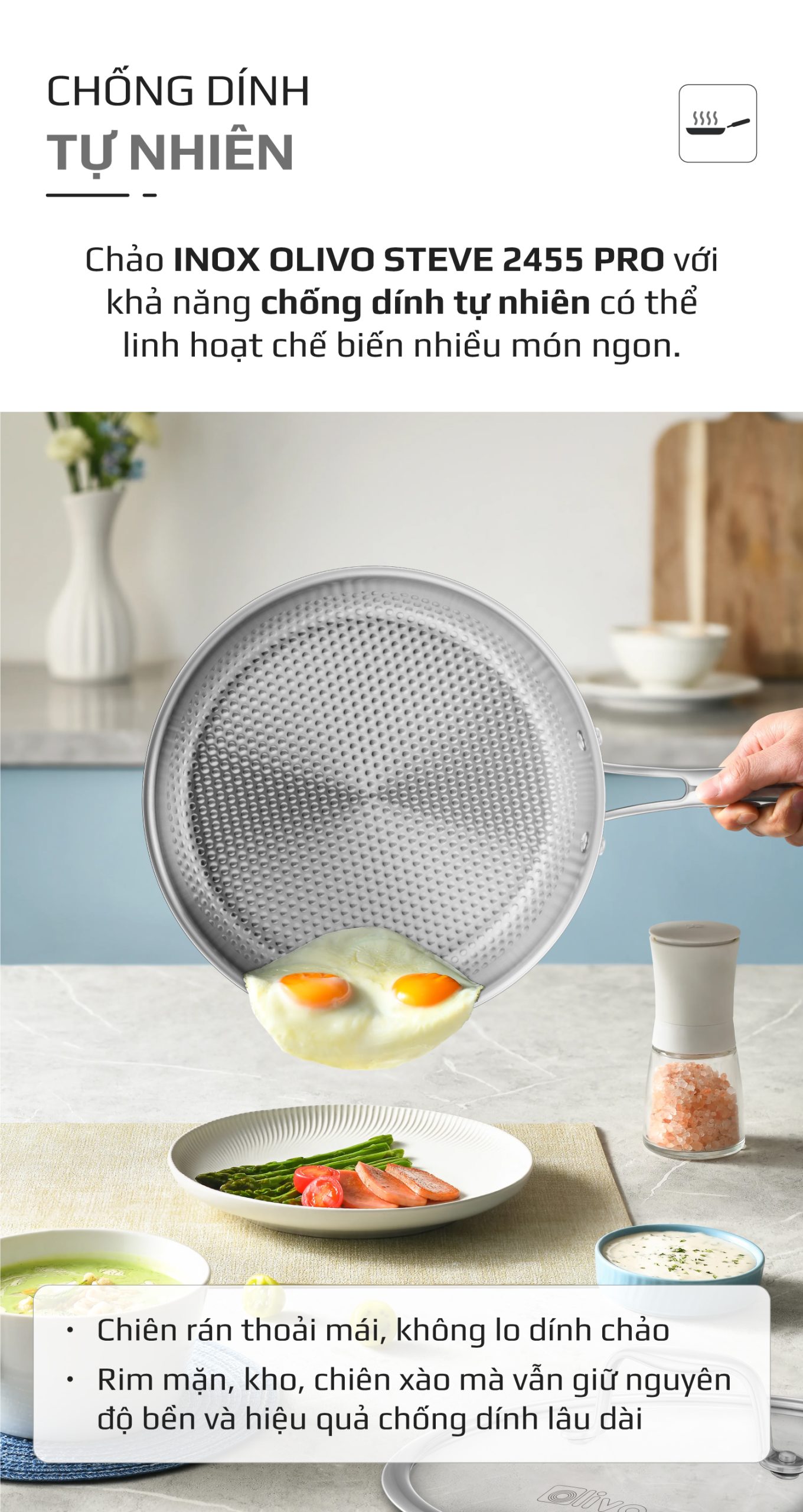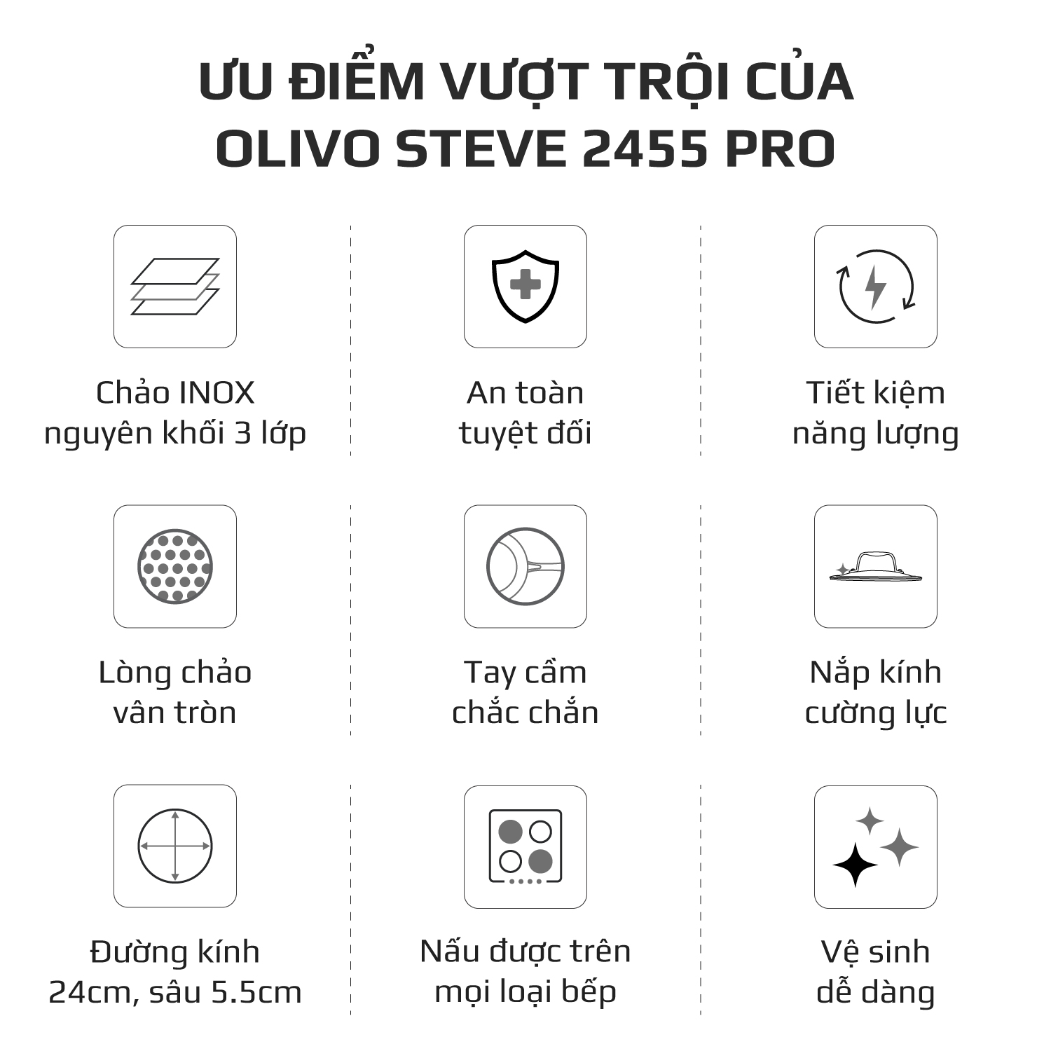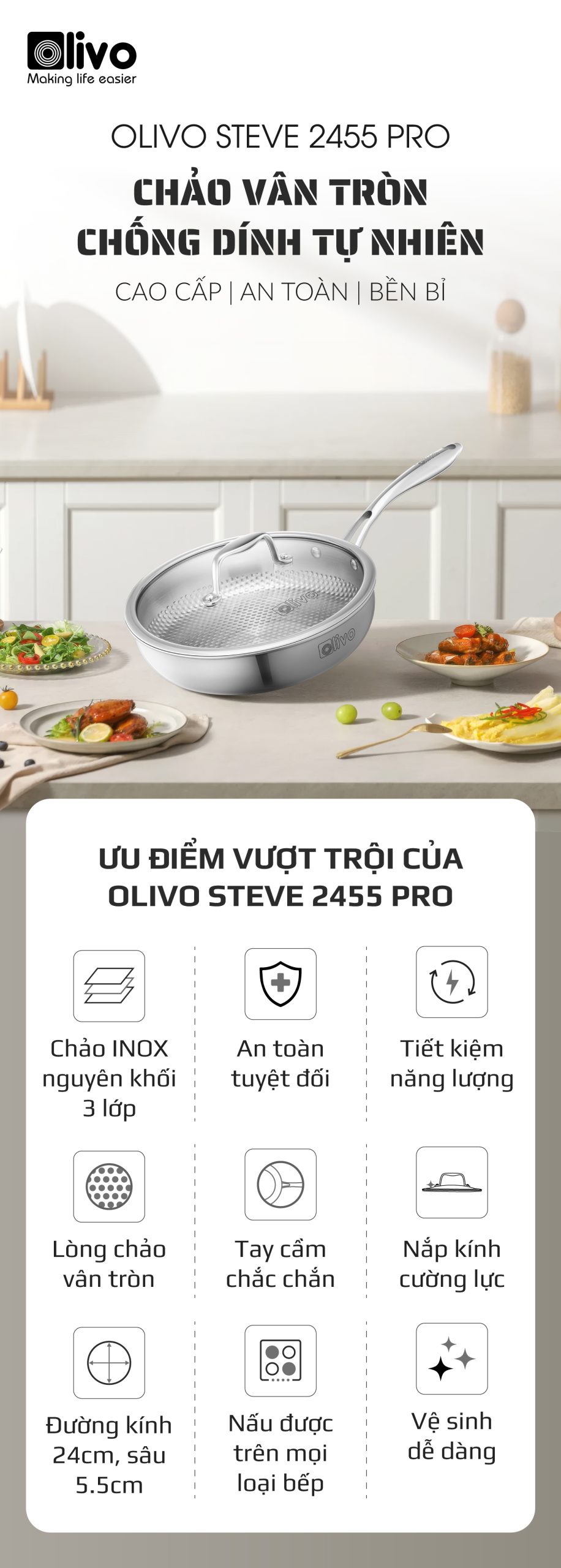 ƯU ĐIỂM VƯỢT TRỘI CỦA SẢN PHẨM CHẢO INOX VÂN TRÒN OLIVO STEVE 2455 PRO