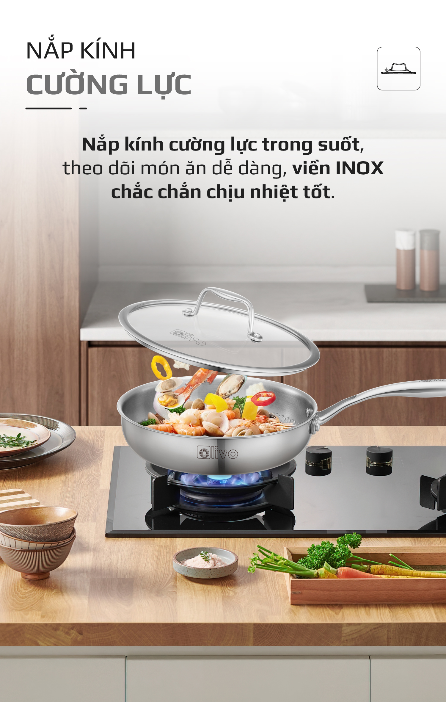 - Nắp kính cường lực trong suốt dễ dàng quan sát thực phẩm trong quá trình nấu nướng mà không cần mở nắp, giúp giữ nhiệt và hương vị trọn vẹn.