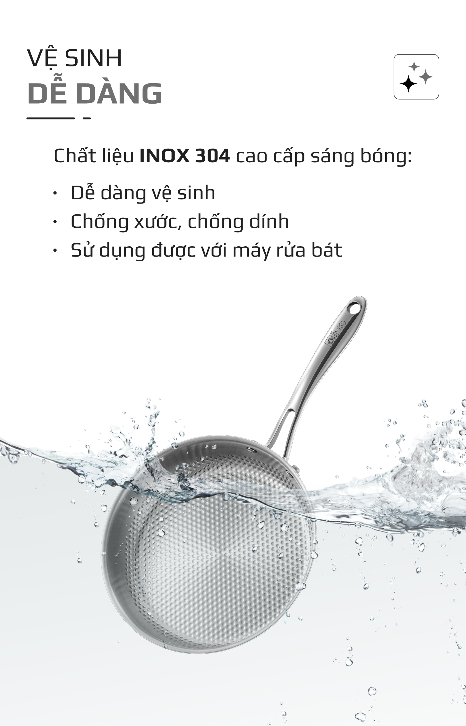 - Bề mặt inox sáng bóng và mịn màng của Chảo Inox vân tròn OLIVO STEVE 2455 PRO giúp hạn chế bám dầu mỡ, không ám mùi thực phẩm, nhờ đó việc làm sạch trở nên vô cùng dễ dàng, chỉ cần một chút nước rửa chén và miếng bọt biển mềm là chảo đã sáng như mới.