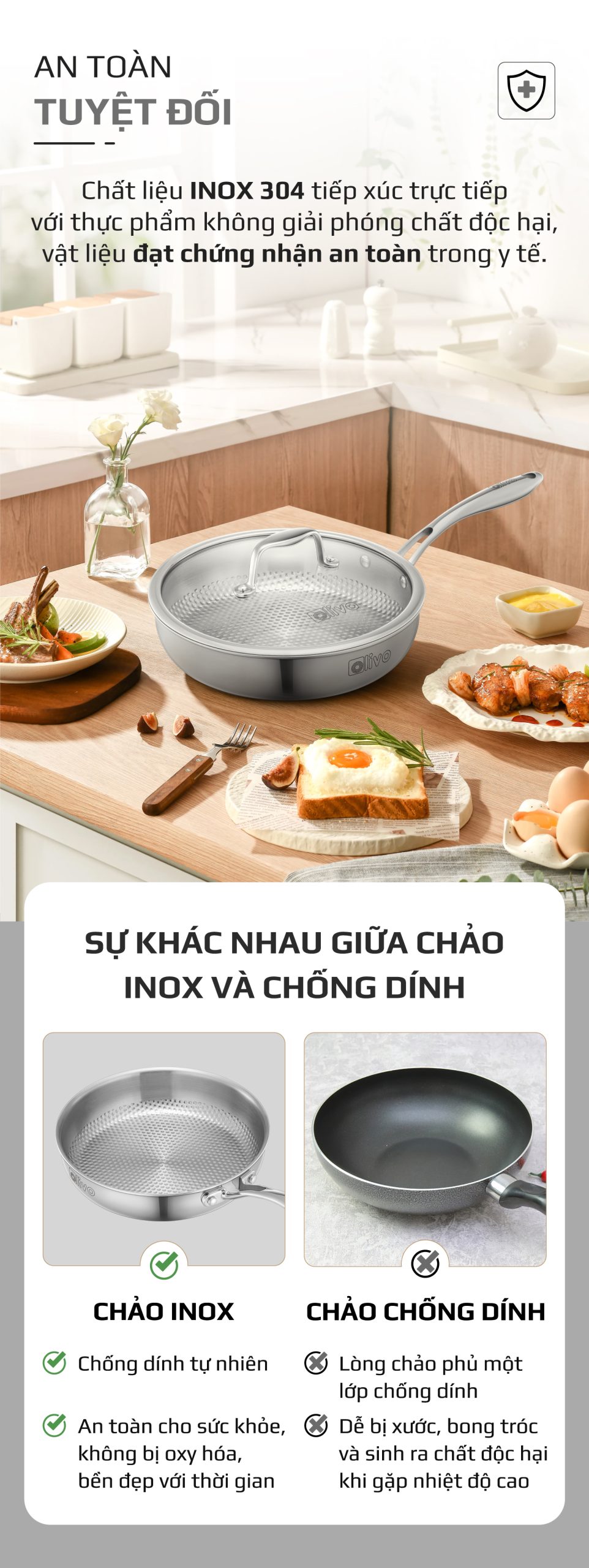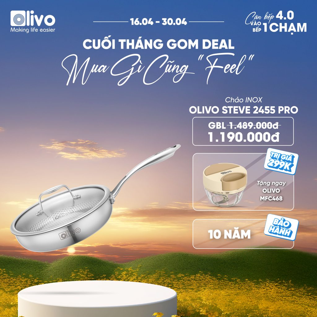 - Không phủ chống dính hóa học, không chứa chất độc hại, chảo Inox vân tròn OLIVO STEVE 2455 PRO mang đến sự an tâm tuyệt đối cho sức khỏe gia đình bạn.