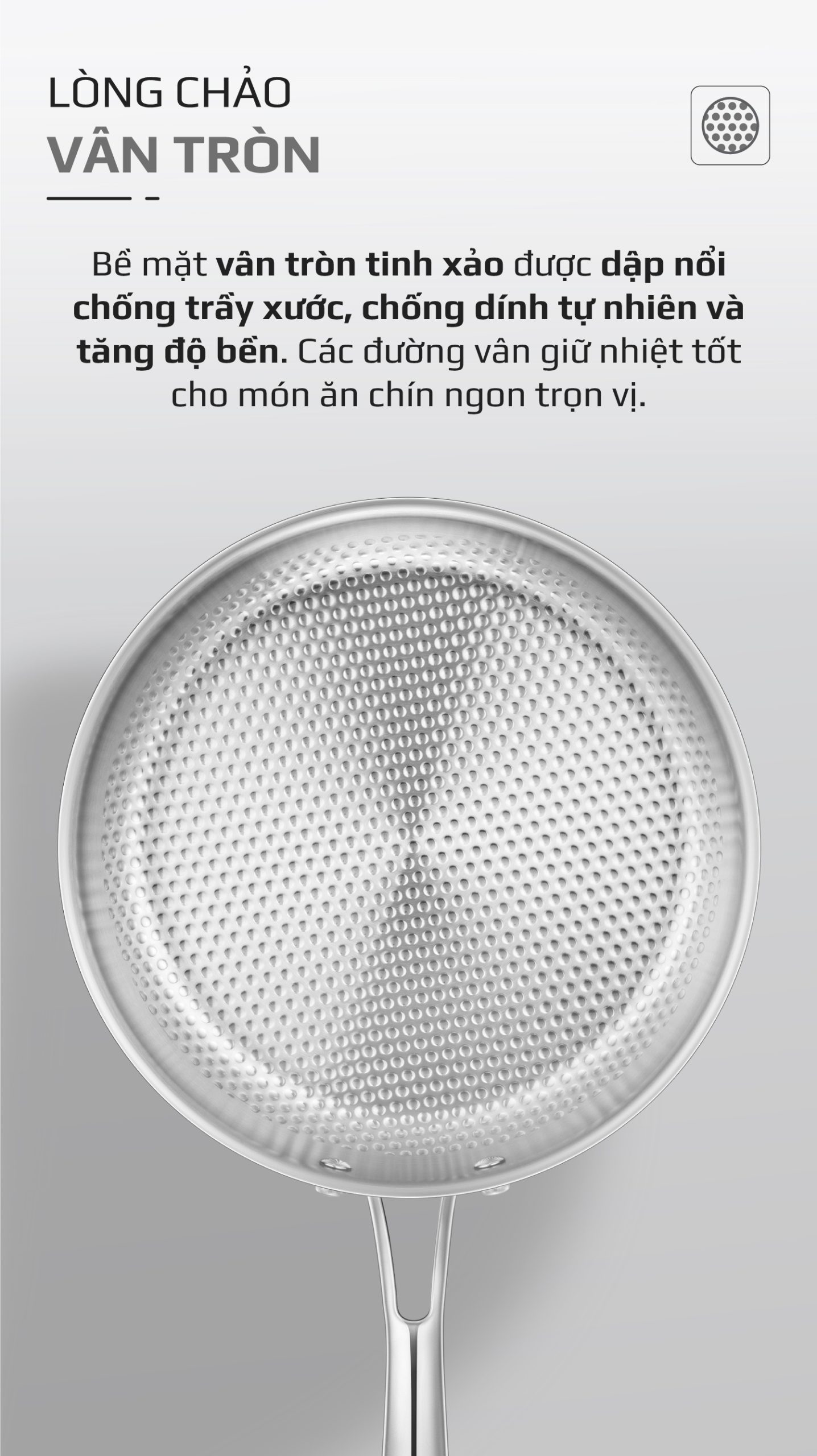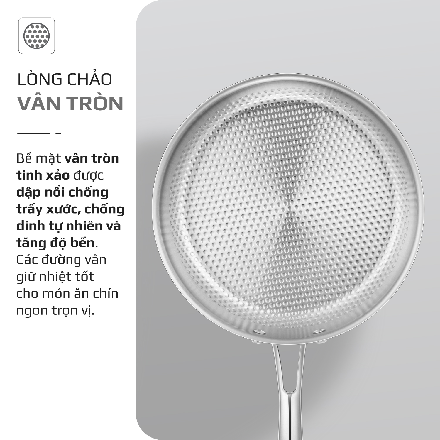 - Các đường vân tròn được thiết kế tỉ mỉ giúp tăng độ ma sát tự nhiên, hạn chế trầy xước và mang lại khả năng chống dính bền lâu.