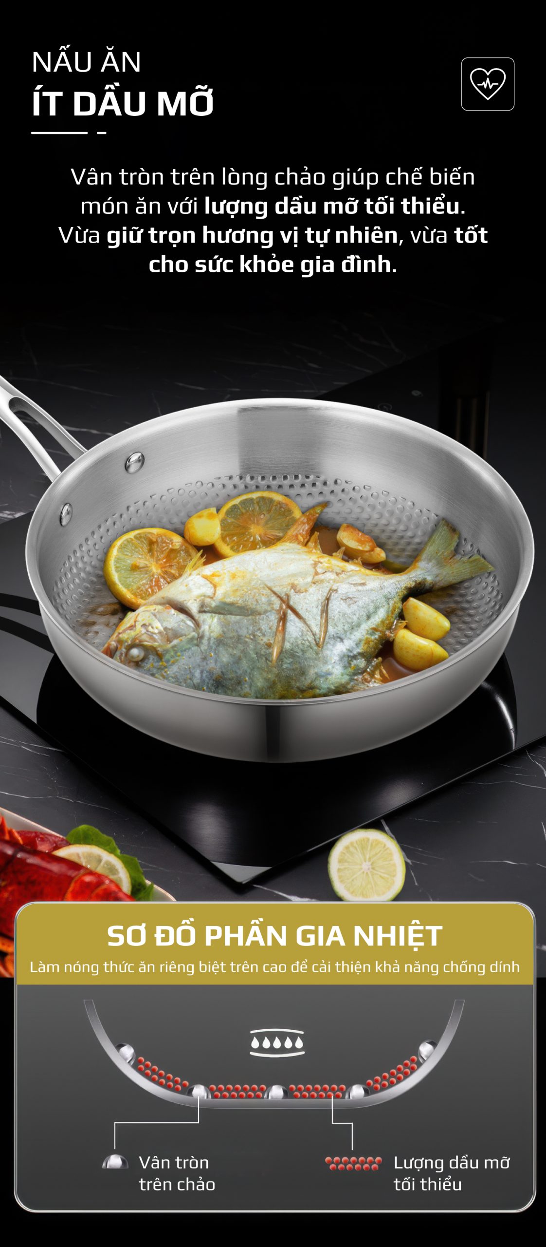 - Đặc biệt, nhờ khả năng tản nhiệt thông minh, chảo cho phép chế biến món ăn với lượng dầu mỡ tối thiểu, vừa giữ trọn hương vị tự nhiên, vừa giúp bữa ăn của gia đình nhẹ bụng và lành mạnh hơn mỗi ngày.