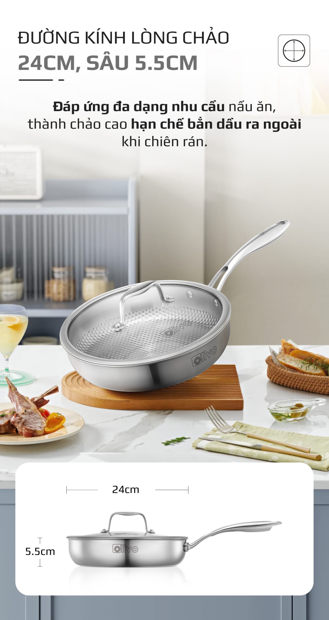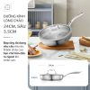 - Lòng chảo đường kính 24cm, sâu 5.5cm, lý tưởng cho các món chiên, xào, rim hay áp chảo, đủ rộng cho bữa ăn gia đình, nhưng vẫn gọn gàng, dễ thao tác.