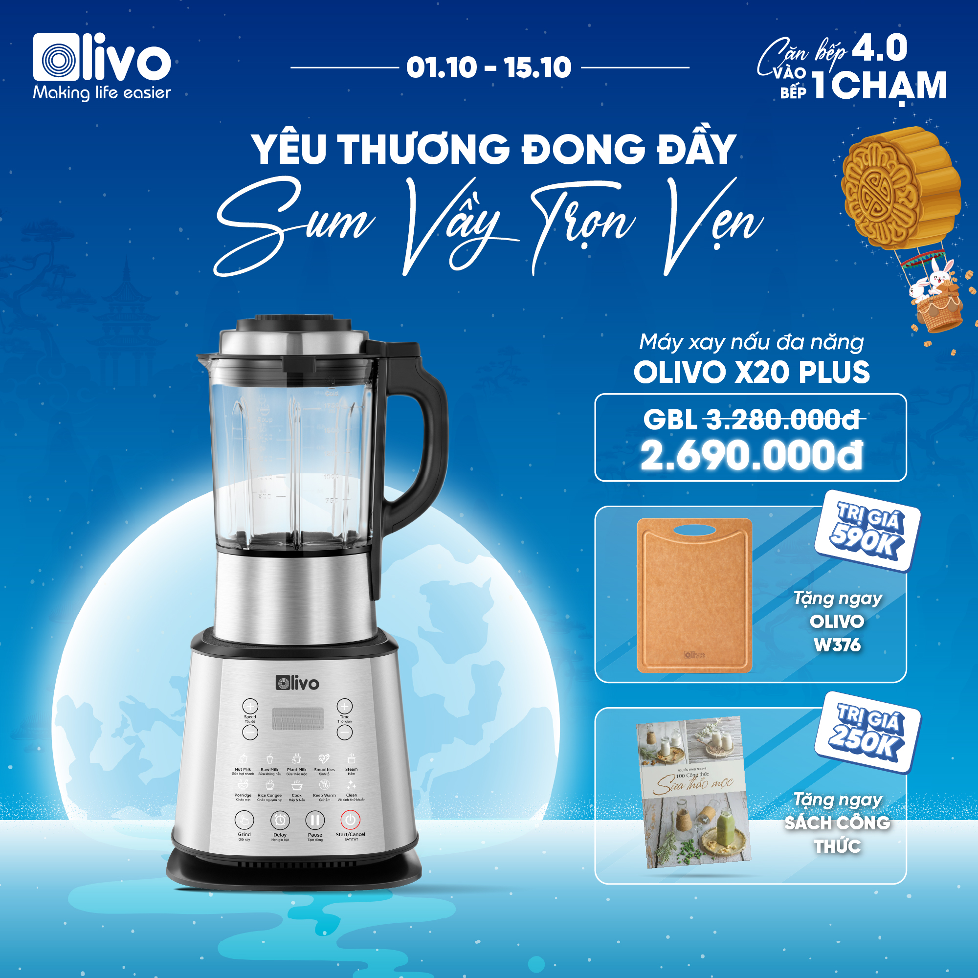 - OLIVO X20 PLUS sở hữu công nghệ cảm biến tự động nhận biết độ cao thông minh. Qua đó, tự động tự động điều chỉnh chương trình và chức năng ở trạng thái làm việc tốt nhất giúp thực phẩm đảm bảo dinh dưỡng, chống tràn, chống khê cối.